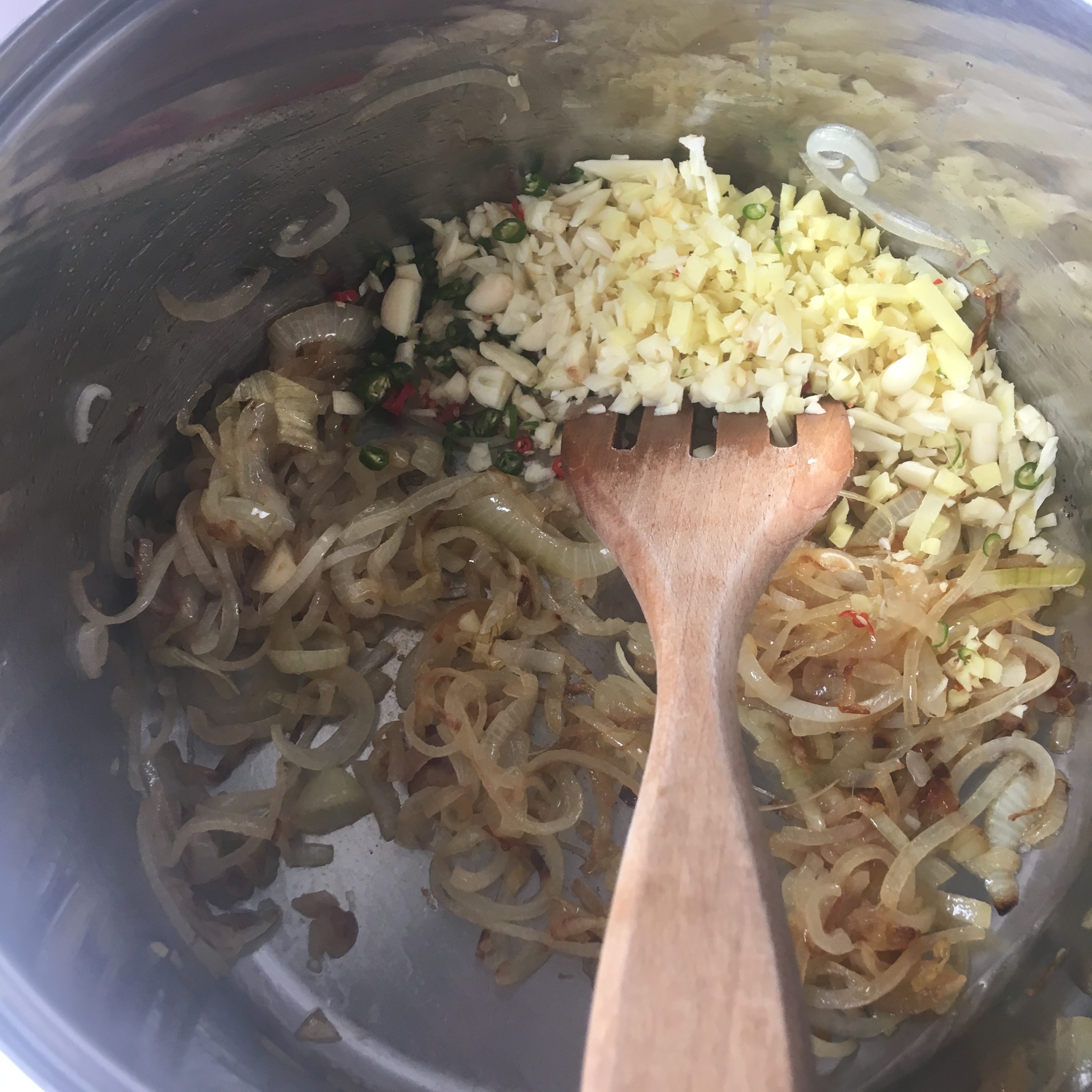 2. Add chopped garlic, ginger, chillis, lightly fry for a further 5 mins