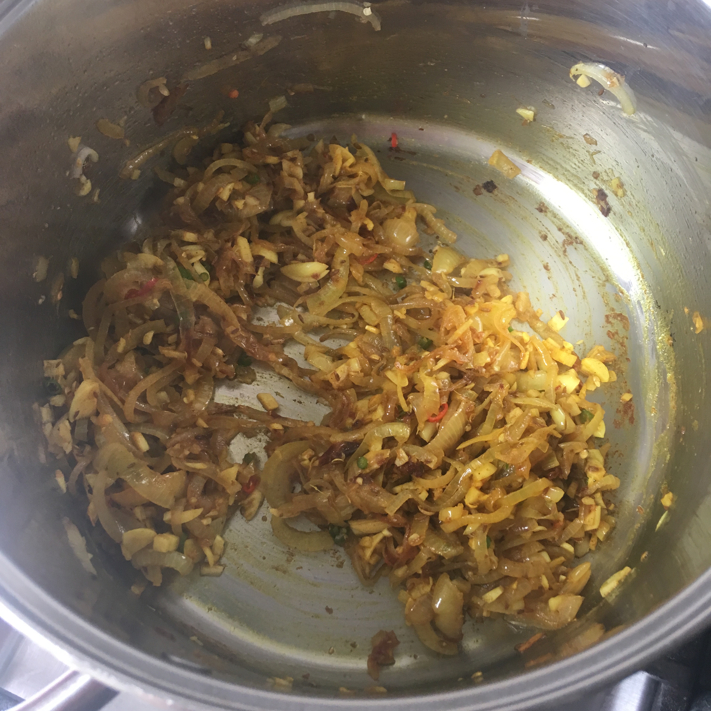 1. Slice onion and add to a frying pan with a small amount of oil, cumin seeds, garlic