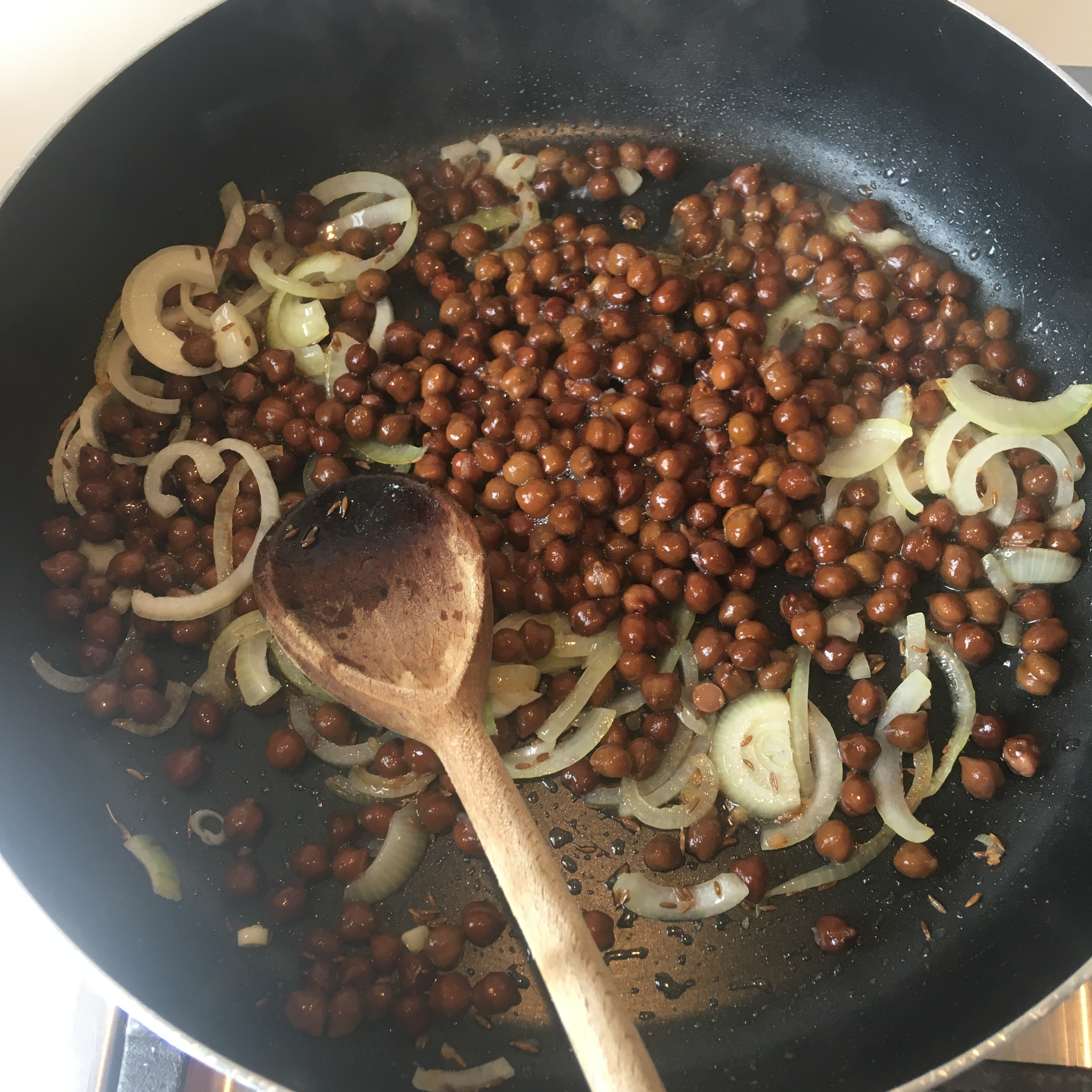2. Add chick peas or chana beans and fry for a further 5 mins